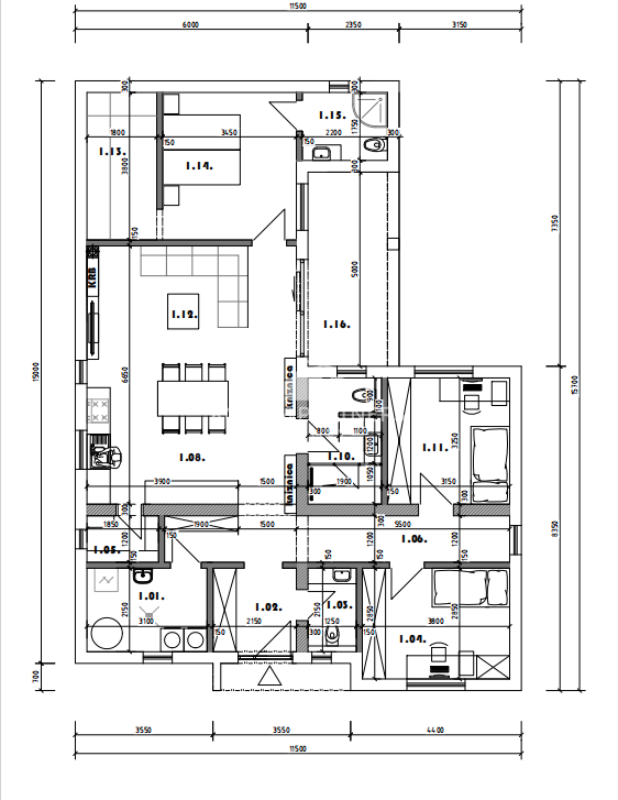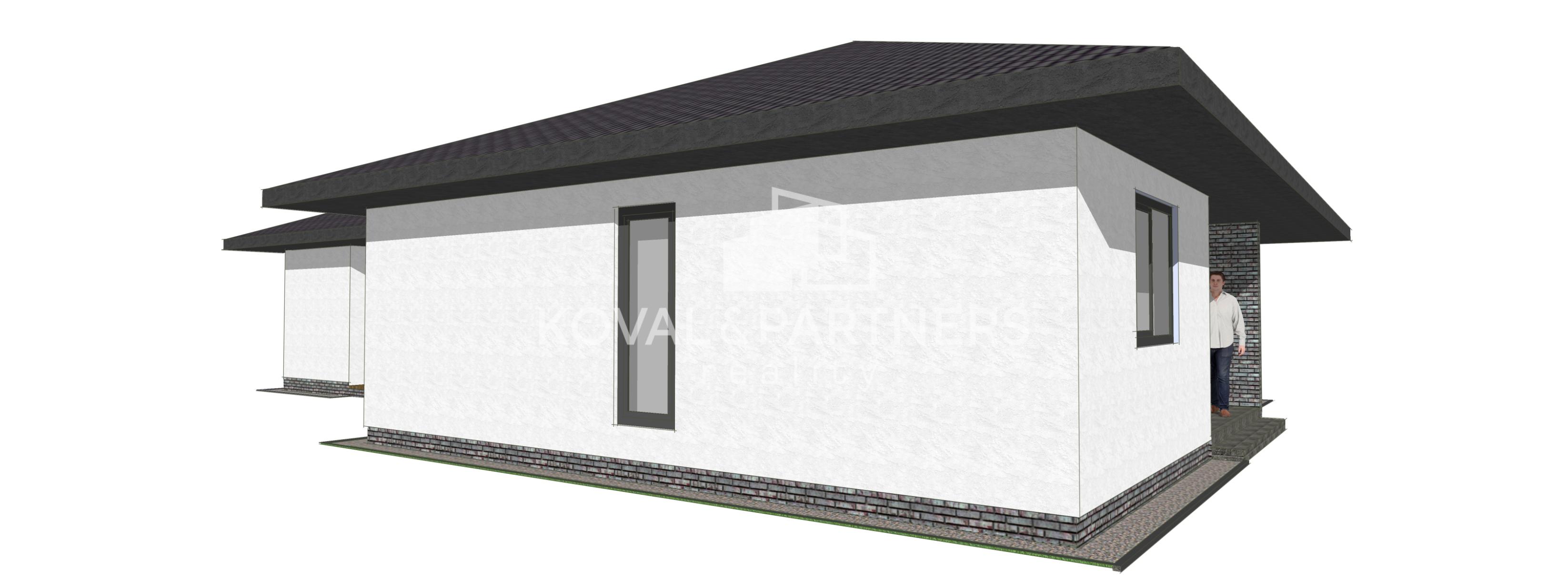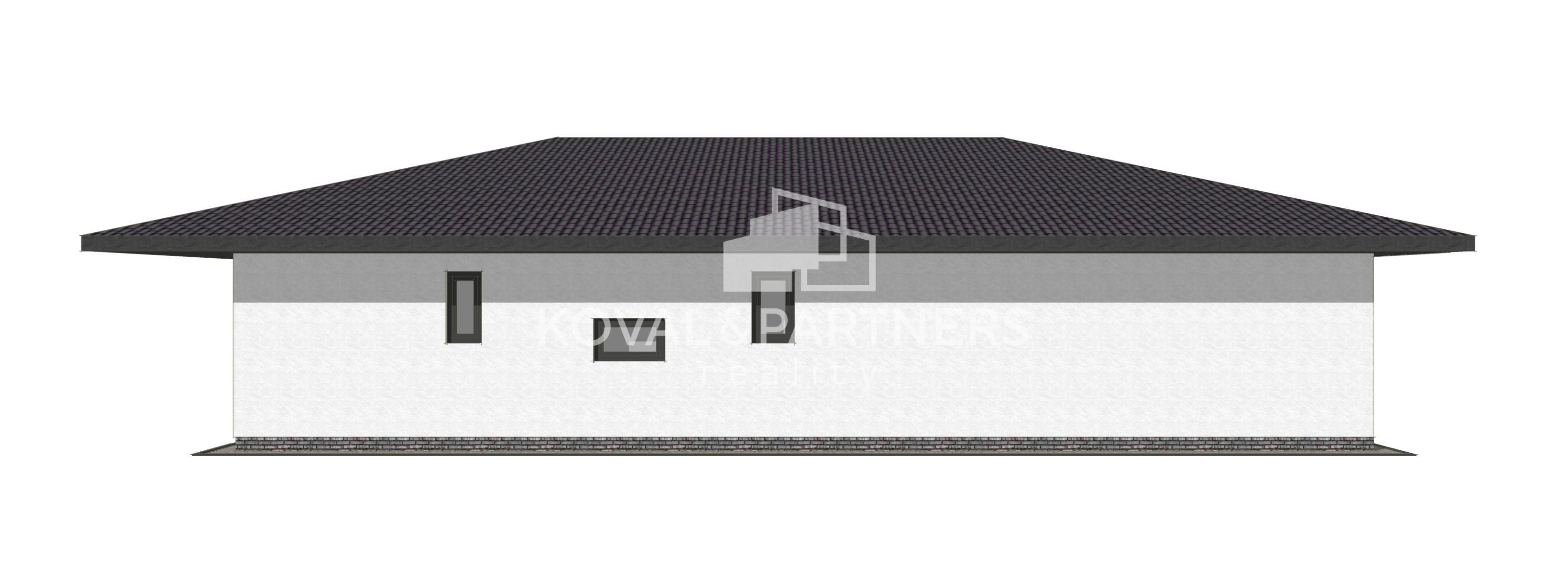 Dom dispozične pozostáva zo vstupnej chodby, samostatnej toalety, technickej miestnosti, chodby, spálne s východom na terasu - veľký priestor na šatník + rodičovská kúpeľňa s toaletou, dvoch neprechodných izieb, kúpeľne s toaletou, špajze, kuchyne prepojenej s obývačkou s východom na terasu.