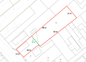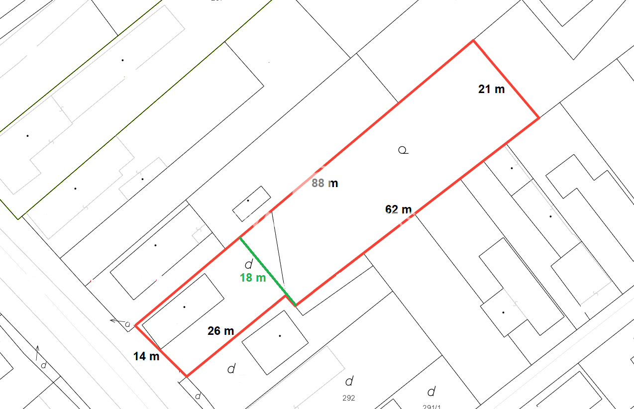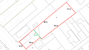 - predná šírka cca 14 m, po 26 m sa rozširuje na cca 18 m, na konci má šírku cca 21 m